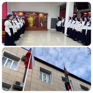 Традиционнач церемония поднятия государственных флагов под гимн Российской Федерации и Чеченской Республики.