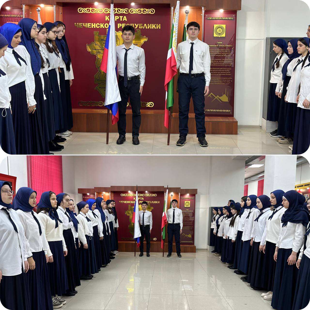 Друзья, доброго времени суток! Учебная неделя в ГБПОУ «Государственный колледж дизайна, моды, пищевой индустрии и сервиса» началась с традиционной церемонии поднятия государственных флагов под гимн Российской Федерации и Чеченской Республики.