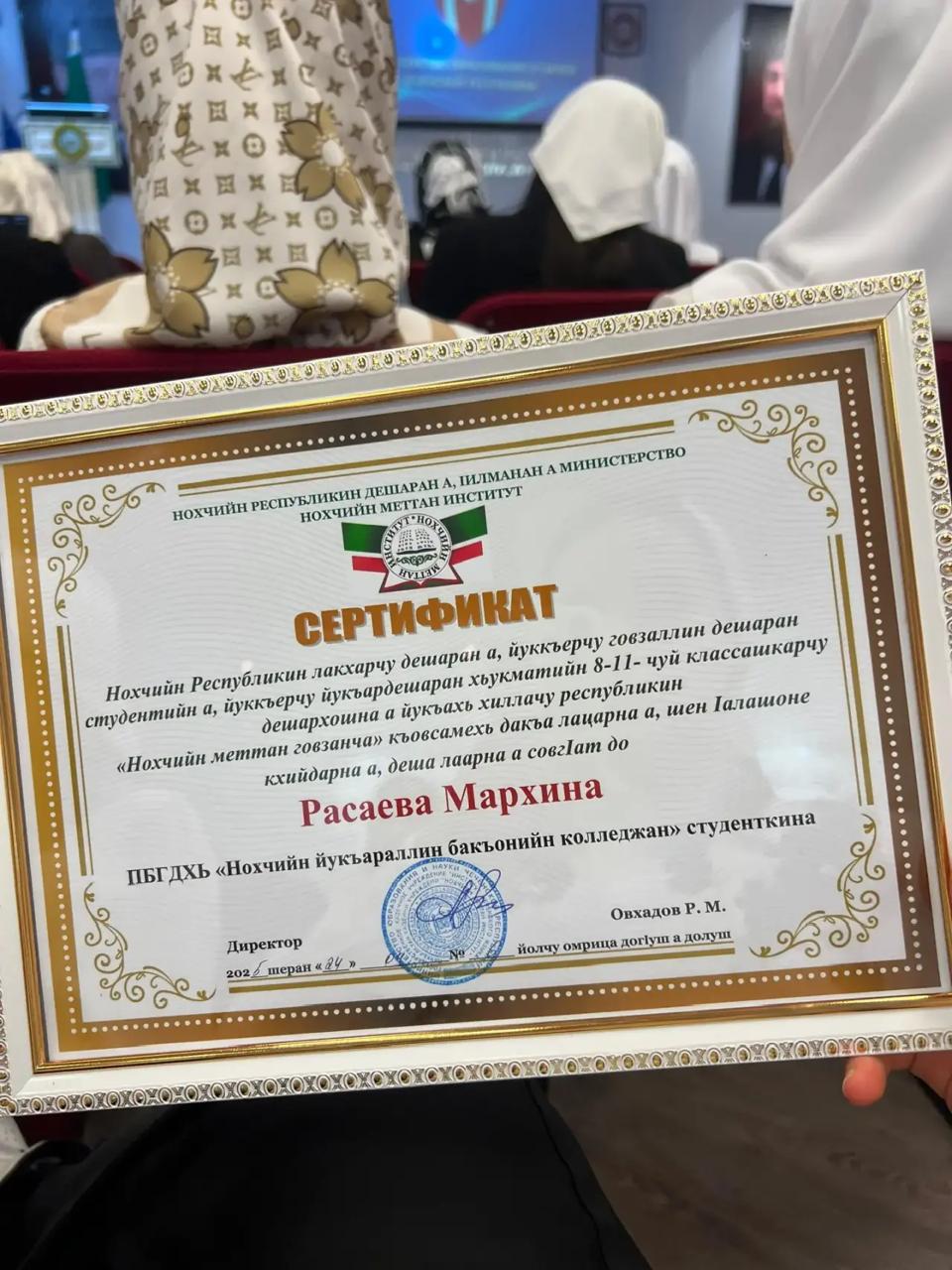 Студентка «Чеченский социально‑правовой колледж» Расаева Марха, приняла участие в республиканском конкурсе «Лучшее сочинение на чеченском языке».Этот конкурс — значимое событие для сохранения и развития чеченского языка и культуры. Участие в таком конкурсе — это не только проверка знаний и литературных навыков, но и важный вклад в сохранение культурного наследия.